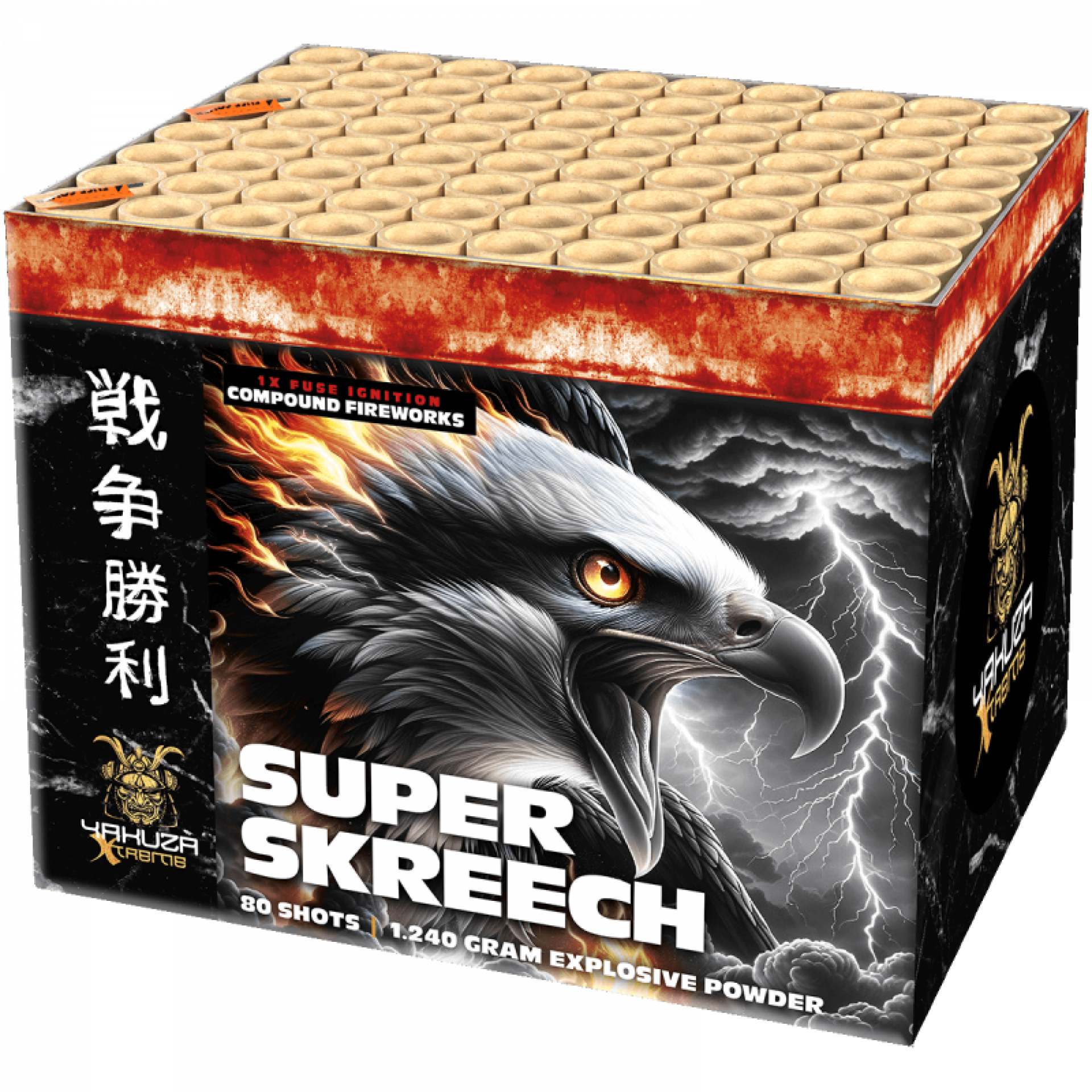 80 shots fluiters met gouden en blauwe peony's, eindigd met een crackling finale. Kan niet ontbreken in jouw show.